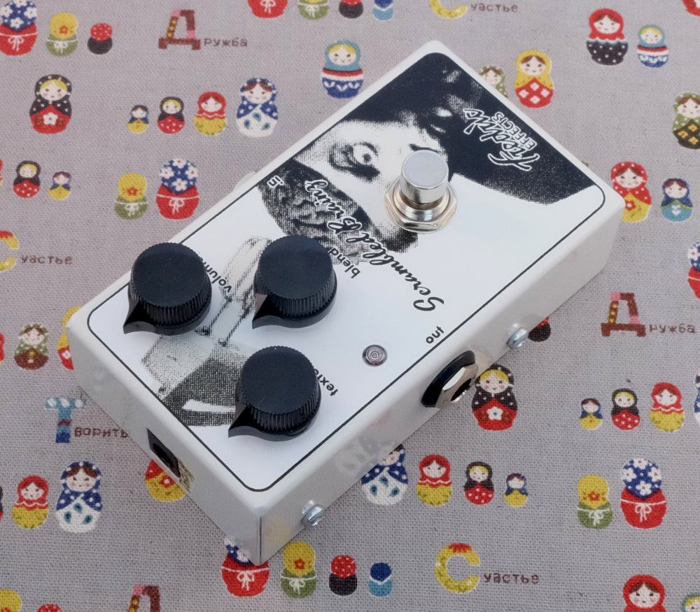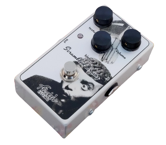 From Fredric Effects - "This is a clone of the rare and desirable Ampeg Scrambler, faithful to the originals with the addition of 9V power jack, status LED, true bypass and now a volume control. The Scrambled Brainz is a harsh upper-octave fuzz with a few ring-mod tones thrown in. 'Texture' sets the amount of upper octave fuzz (so turned down it sounds like a 'normal' fuzz pedal, and turned up you get octave and ring-mod sounds) and 'blend' sets the mix with your clean guitar sound. Due to popular demand, we've added a boost circuit and volume control, so you no longer have to make do with the unity gain of the original circuit."