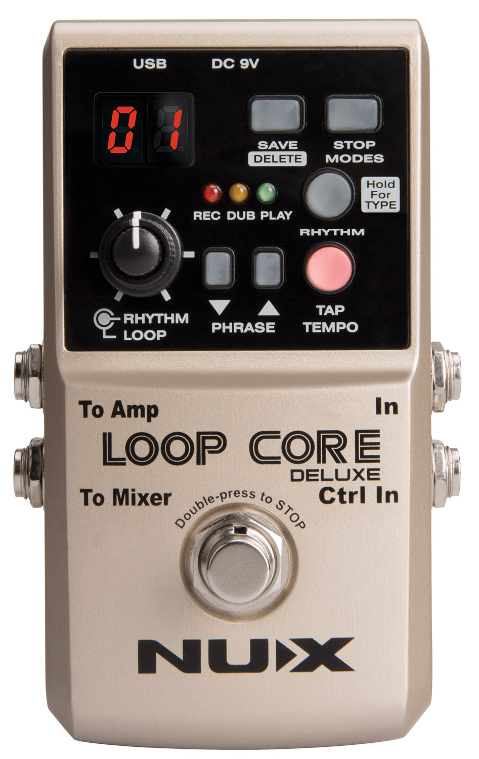 With upgraded hardware, the new Loop Core Deluxe allows you to record loop phrases up to 8 hours with unlimited layers in 24-bit high-resolution audio quality into 99 saved memories. Stop Modes To finish your playing, you can choose 3 different modes: 1- NORMAL MODE: Double tap - Instant Stop 2- FINISH MODE: Plays until the end of the last measure 3- FADE OUT MODE: 10 seconds Fade-Out Importing and Backing up Your Loop Phrases Connect your Loop Core Deluxe to your PC/Mac with a Mini-B USB connector to import available loop phrases or to back up yours. Loop Core Deluxe is only compatible with 24-bit/44.1kHz WAV files. Loop Core Deluxe Bundle The LOOP CORE BUNDLE includes the additional NMP-2 DUAL foot switch which is used to switch between loop phrases. Your recordings for verse, chorus, and bridge parts, can now be seamlessly accessed utilising the convenient DUAL foot switch.
