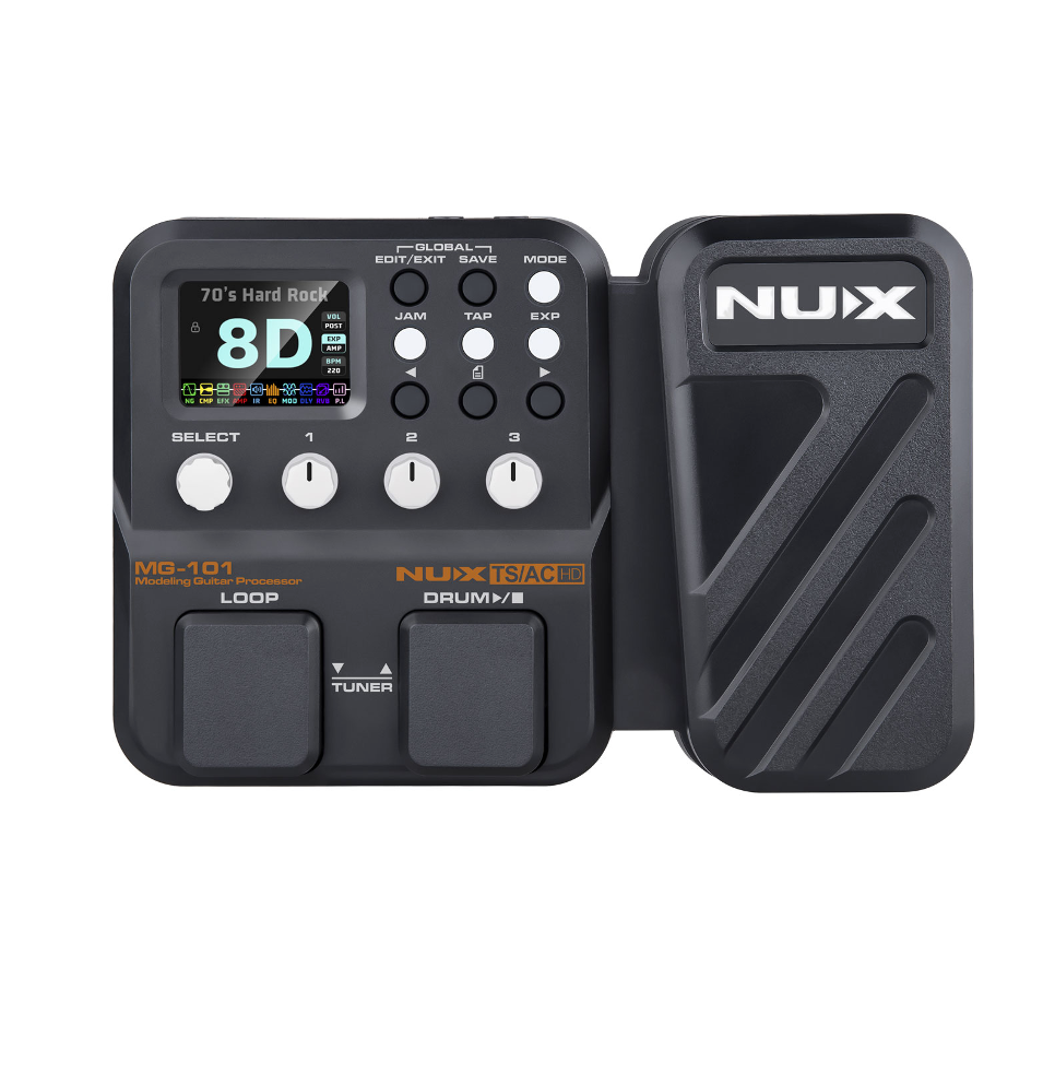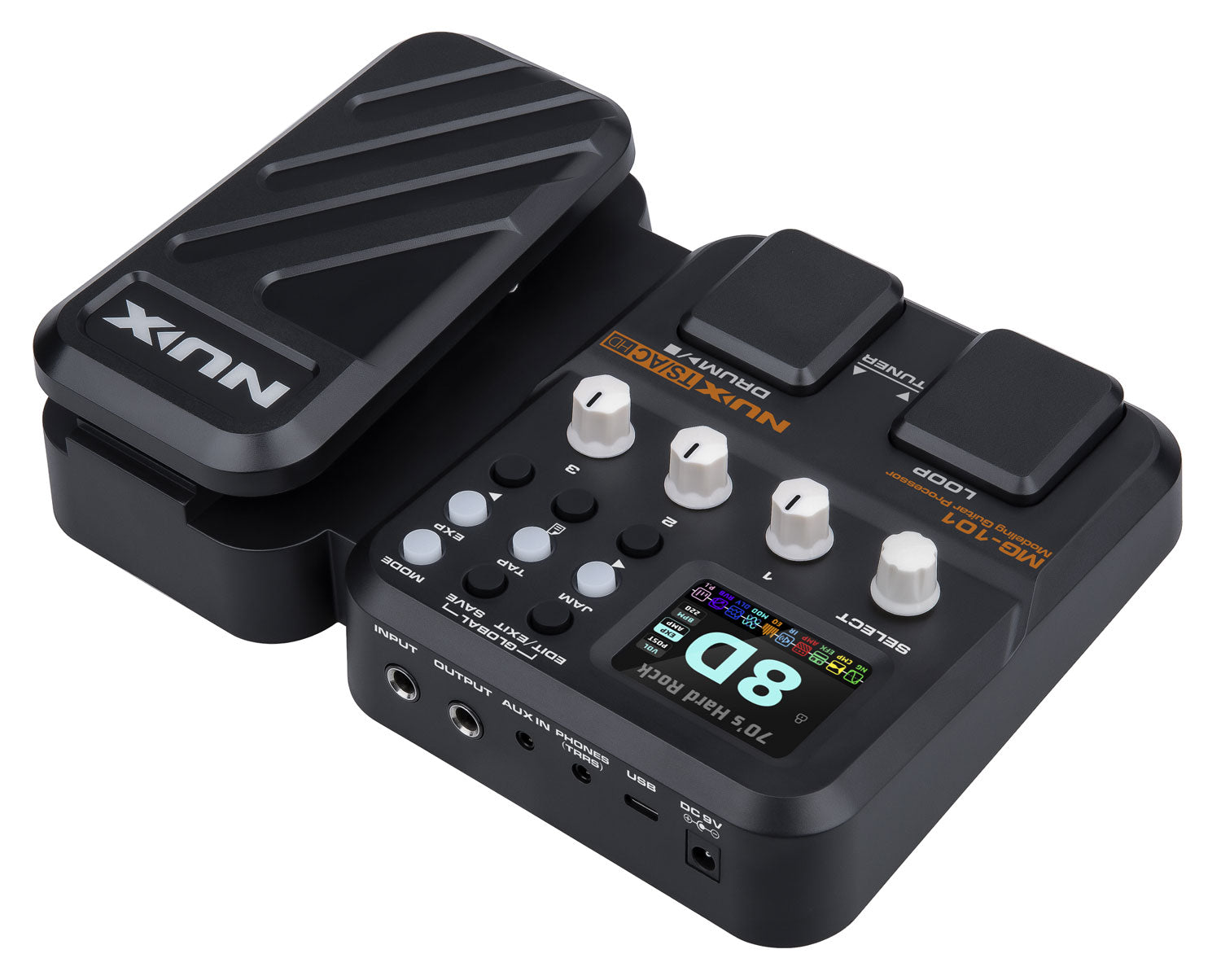 MG-101 is a complete guitarist's tone companion in a compact yet versatile floor unit. Hiding inside the minimalist housing is a full suite of amplifier tones and a huge palette of guitar and bass effects across 10 distinct audio processing blocks. Amp modelling is based on TSAC-HD White Box Amp Modeling Technology, which delivers high definition analogue circuit simulation for pro quality guitar tones, with speaker cabinet emulation processed via an impulse response (IR) loader with 25 internal models and 12 additional user slots for importing your own files. A built-in expression pedal covers wah and swell effects amongst other possibilities. All settings can be edited onboard with parameters shown on the full colour display or via USB using the downloadable PC/Mac Quicktone software and then stored into one of 36 internal memory locations for recalling at will. In addition to the internal metronome, the built-in Jam function has a fully featured drum machine and 30 second stereo (60s mono) phrase looper. To integrate with a DAW studio suite, the USB also functions as a high quality audio interface, completing the studio-ready guitar rig. The main output can deliver stereo or mono audio directly to a PA or to guitar amplifiers, with a separate TRRS minijack output for headphones or 2-way connection to a smart phone for live streaming. Without breaking the bank, you can have world-class amp modelling and effects with all the essential tools a recording and gigging guitarist needs in a portable and convenient package.